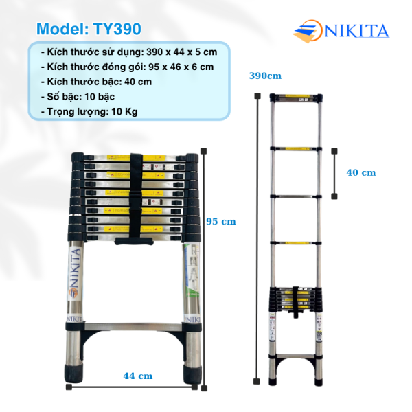 Thang INOX 10 Bậc NIKITA TY-390 là dòng thang rút đơn inox cao cấp với 10 bậc chắc chắn, cho phép kéo dài tối đa lên đến 3,9 mét. So với các model nhỏ hơn (như TY-270 hay TY-310), sản phẩm này đáp ứng được nhiều tình huống yêu cầu làm việc ở tầm cao như: bảo trì điện, thi công công trình, vệ sinh kính nhà cao tầng, hoặc lắp đặt biển hiệu.